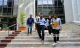 Komisioner KPK periode 2015-2019 Saut Situmorang (kiri) berbincang bersama peneliti Indonesia Corruption Watch (ICW) Kurnia Ramadhana (tengah) dan Koalisi Masyarakat Sipil Kawal Pemilu Bersih usai mengajukan uji materi ke Gedung Mahkamah Agung Republik Indonesia, Jakarta, Senin (12/6/2023). Koalisi Masyarakat Sipil Kawal Pemilu Bersih bersama Indonesia Corruption Watch (ICW) dan Komisioner KPK 2015-2019 Saut Situmorang mengajukan uji materi Peraturan Komisi Pemilihan Umum Nomor 10 dan 11 Tahun 2023 ke Mahkamah Agung. ICW menilai dalam peraturan tersebut KPU memberikan celah kepada para koruptor untuk maju dalam kontestasi pemilu legislatif. (FOTO : Republika/Thoudy Badai)