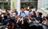 Komisioner KPK periode 2015-2019 Saut Situmorang bersama peneliti Indonesia Corruption Watch (ICW) Kurnia Ramadhana dan Koalisi Masyarakat Sipil Kawal Pemilu Bersih saat menjawab pertanyaan jurnalis di Gedung Mahkamah Agung Republik Indonesia, Jakarta, Senin (12/6/2023). Koalisi Masyarakat Sipil Kawal Pemilu Bersih bersama Indonesia Corruption Watch (ICW) dan Komisioner KPK 2015-2019 Saut Situmorang mengajukan uji materi Peraturan Komisi Pemilihan Umum Nomor 10 dan 11 Tahun 2023 ke Mahkamah Agung. ICW menilai dalam peraturan tersebut KPU memberikan celah kepada para koruptor untuk maju dalam kontestasi pemilu legislatif. (FOTO : Republika/Thoudy Badai)