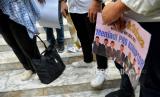 Peewakilan dari Indonesia Corruption Watch (ICW) dan Koalisi Masyarakat Sipil Kawal Pemilu Bersih memegang poster usai mengajukan uji materi di Gedung Mahkamah Agung Republik Indonesia, Jakarta, Senin (12/6/2023). Koalisi Masyarakat Sipil Kawal Pemilu Bersih bersama Indonesia Corruption Watch (ICW) dan Komisioner KPK 2015-2019 Saut Situmorang mengajukan uji materi Peraturan Komisi Pemilihan Umum Nomor 10 dan 11 Tahun 2023 ke Mahkamah Agung. ICW menilai dalam peraturan tersebut KPU memberikan celah kepada para koruptor untuk maju dalam kontestasi pemilu legislatif. (FOTO : Republika/Thoudy Badai)