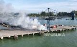 REPUBLIKA.CO.ID,ACEH BARAT -- Foto udara suasana kebakaran conveyor batu bara milik perusahaan tambang PT Bumi Tambang Indah (BTI) di pelabuhan Jetty Meulaboh, Aceh Barat, Aceh, Selasa (13/6/2023).