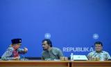 Ketua Majelis Hukum dan HAM PP Muhammadiyah, Trisno Raharjo (dari kiri ke kanan), Ketua Pusat Kajian Antikorupsi (PUKAT) UGM Totok Dwi Diantoro, dan Wakil Ketua MHH PP Muhammadiyah Rahmat Muhajir Nugroho menyampaikan paparan terkait perpanjangan masa jabatan ketua KPK di Gedung PP Muhammadiyah, Yogyakarta, Selasa (12/6/2023). MHH PP Muhammadiyah menolak hasil putusan MK terkait perpanjangan masa jabatan ketua KPK. Dan meminta pemerintah untuk melanjutkan proses seleksi pimpinan KPK 2023-2027. (FOTO : Republika/Wihdan Hidayat)