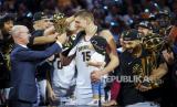Pebasket Denver Nuggets Nikola Jokic (tengah) mengangkat penghargaan menjadi pemain terbaik /MVP setelah timnya memenangkan Kejuaraan NBA dengan kemenangan atas Miami Heat di Game 5 Final NBA bola basket, di Ball Arena, Denver, AS, Selasa, (13/6/2023)WIB. (FOTO : AP Photo/Jack Dempsey)