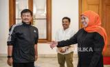 REPUBLIKA.CO.ID,SURABAYA -- Gubernur Jawa Timur Khofifah Indar Parawansa (kanan) berbincang dengan pelatih Timnas U-22 Indra Sjafri (kiri) saat berkunjung di Gedung Negara Grahadi, Surabaya, Jawa Timur, Selasa (13/6/2023). Kunjungan tersebut untuk membahas pembinaan sepak bola usia dini di Jawa Timur.