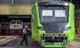 Pekerja beraktivitas di dekat kereta pengumpan (feeder) di Depo Lokomotif Stasiun Bandung, Kota Bandung, Jawa Barat, Rabu (14/6/2023). PT Kereta Api Indonesia (KAI) menyiapkan sarana dan fasilitas pendukung berupa kereta feeder, peron khusus dan ruang tunggu khusus untuk penumpang KCJB yang beroperasi dari Stasiun Kereta Cepat Padalarang menuju Stasiun Bandung dan sebaliknya. (FOTO : ABDAN SYAKURA/REPUBLIKA)
