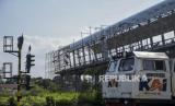 Pekerja menyelesaikan proyek pembangunan jembatan layang (skybridge) menuju peron Kereta Cepat Jakarta Bandung (KCJB) di Stasiun Bandung, Kota Bandung, Jawa Barat, Rabu (14/6/2023). PT Kereta Api Indonesia (KAI) menyiapkan sarana dan fasilitas pendukung berupa kereta feeder, peron khusus dan ruang tunggu khusus untuk penumpang KCJB yang beroperasi dari Stasiun Kereta Cepat Padalarang menuju Stasiun Bandung dan sebaliknya. (FOTO : ABDAN SYAKURA/REPUBLIKA)