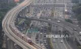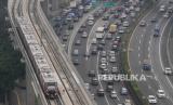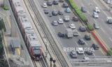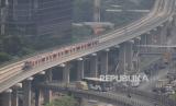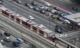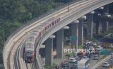 Rangkaian kereta LRT Jakarta-Bogor-Depok-Bekasi (Jabodebek) melintas di Jalan Gatot Subroto, Jakarta Selatan, Kamis (14/6/2023). Proyek pembangunan LRT Jabodebek telah mencapai 95,09 persen dan akan melakukan uji coba penumpang secara terbatas dengan tarif Rp 1 pada 12 Juli hingga 15 Agustus 2023. (FOTO : Republika/Putra M. Akbar)