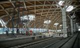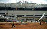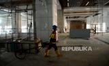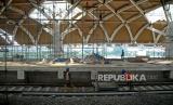 Pekerja beraktivitas di proyek pembangunan Stasiun Halim Kereta Cepat Jakarta-Bandung (KCJB), Jakarta, Rabu (14/6/2023). Sejauh ini progres proyek Stasiun Halim Kereta Cepat Jakarta-Bandung (KCJB) telah mencapai 92 persen. PT Kereta Cepat Indonesia China (KCIC) menyatakan operasional Kereta Cepat Jakarta Bandung atau KCJB akan beroperasional penuh mulai bulan Oktober 2023. Sejauh ini, KCIC masih terus melakukan uji coba kecepatan kereta serta penyelesaikan stasiun dan sarana prasarana kereta cepat. (FOTO : Republika/Prayogi)