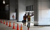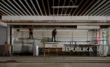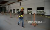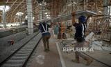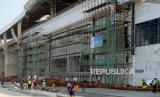 Pekerja menyelesaikan proyek pembangunan Stasiun Halim Kereta Cepat Jakarta-Bandung (KCJB), Jakarta, Rabu (14/6/2023). Sejauh ini progres proyek Stasiun Halim Kereta Cepat Jakarta-Bandung (KCJB) telah mencapai 92 persen. PT Kereta Cepat Indonesia China (KCIC) menyatakan operasional Kereta Cepat Jakarta Bandung atau KCJB akan beroperasional penuh mulai bulan Oktober 2023. Sejauh ini, KCIC masih terus melakukan uji coba kecepatan kereta serta penyelesaikan stasiun dan sarana prasarana kereta cepat. (FOTO : Republika/Prayogi)