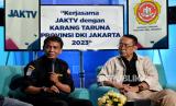Direktur Pemberitaan JAKTV Tian Bachtiar (kanan) bersama Ketua Karang Taruna Provinsi DKI Jakarta Muhammad Mul (kiri) saat acara penandatanganan perjanjian kerjasama di Kantor JAKTV, Jakarta, Rabu (14/6/2023). JAKTV bersama Karang Taruna Provinsi DKI Jakarta menjalin kerjasama terkait pelatihan citizen journalist bagi anggota karang taruna se-Provinsi DKI Jakarta sebagai upaya pemberdayaan anggota dalam bidang jurnalis televisi yang nantinya diharapkan mampu berkolaborasi bersama JAKTV sebagai kontributor berita di seluruh wilayah DKI Jakarta. (FOTO : Republika/Thoudy Badai)