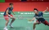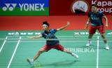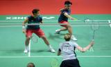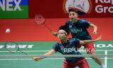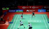 REPUBLIKA.CO.ID, JAKARTA -- Pebulu tangkis ganda putri Indonesia Apriyani Rahayu dan Siti Fadia Silva Ramadhanti mengembalikan kok ke arah ganda putri Jerman Linda Efler dan Isabel Lohau dalam babak 32 besar Kapal Api Group Indonesia Open 2023 di Istora Senayan, Jakarta, Rabu (14/6/2023).