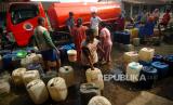 REPUBLIKA.CO.ID, TEGAL -- Sejumlah warga antre untuk mendapatkan jatah saat penyaluran air bersih di Desa Tamansari, Kabupaten Tegal, Jawa Tengah, Rabu (14/6/2023).