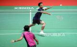 REPUBLIKA.CO.ID, JAKARTA -- Pebulu tangkis tunggal putra Indonesia Anthony Sinisuka Ginting mengembalikan kok ke arah tunggal putra India Priyanshu Rajawat dalam babak 16 besar Kapal Api Group Indonesia Open 2023 di Istora Senayan, Jakarta, Kamis (15/6/2023).