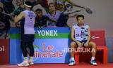 Pebulu tangkis ganda putra Indonesia Fajar Alfian dan Muhammad Rian Ardianto beristirahat saat melawan ganda putra Cina Ren Xiang Yu dan Tan Qiang dalam babak 16 besar Kapal Api Group Indonesia Open 2023 di Istora Senayan, Jakarta, Kamis (15/6/2023). Ganda putra Indonesia nomor satu dunia itu sukses memetik kemenangan dengan skor 21-14 dan 21-17 dengan waktu 39 menit dan memastikan melaju ke perempat final Indonesia Open 2023 (FOTO : Republika/Prayogi)