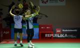 Pebulu tangkis ganda putra Indonesia Fajar Alfian dan Muhammad Rian Ardianto menyapa penonton usai melawan ganda putra Cina Ren Xiang Yu dan Tan Qiang dalam babak 16 besar Kapal Api Group Indonesia Open 2023 di Istora Senayan, Jakarta, Kamis (15/6/2023). Ganda putra Indonesia nomor satu dunia itu sukses memetik kemenangan dengan skor 21-14 dan 21-17 dengan waktu 39 menit dan memastikan melaju ke perempat final Indonesia Open 2023 (FOTO : Republika/Prayogi)