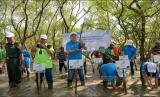 Jajaran manajemen Asuransi Astra serta tamu undangan dari masyarakat setempat saat bersama-sama melakukan penanaman bibit pohon mangrove di Ekowisata Mangrove Wonorejo, Surabaya. (FOTO : Dok Republika )