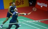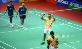 REPUBLIKA.CO.ID, JAKARTA -- Pebulu tangkis ganda putra Indonesia Fajar Alfian dan Muhammad Rian Ardianto mengembalikan kok ke arah pebulu tangkis ganda putra India Satwiksairaj Rankireddy dan Chirag Shetty dalam babak perempat final Kapal Api Group Indonesia Open 2023 di Istora Senayan, Jakarta, Jumat (16/6/2023).