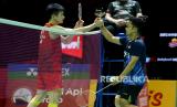 Pebulu tangkis tunggal putra Indonesia Anthony Ginting berjabat tangan dengan tunggal putra China Li Shi Feng. (FOTO : Republika/Prayogi)