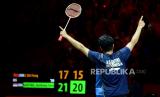 Tunggal putra Indonesia Anthony Ginting merayakan kemenangan atas tunggal putra China Li Shi Feng. (FOTO : Republika/Prayogi)