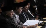 Wakil Menteri Agama Zainut Tauhid Saadi (tengah) bersama Ketua MUI KH Abdullah Jaidi, Ketua Komisi VIII DPR Ashabul Khafi, Dirjen Bimas Islam Kementerian Agama Kamaruddin Amin dan Imam Besar Masjid Istiqlal Nasaruddin Umar (dari kiri ke kanan) bersiap memulai sidang isbat di Jakarta, Ahad (18/6/2023). Pemerintah menetapkan Hari Raya Iduladha 1444 Hijriyah jatuh pada Kamis (29/6/2023), berdasarkan pemantauan atau rukyatul hilal yang dilaksanakan pada 99 titik di Indonesia. (FOTO : Republika/Putra M. Akbar)