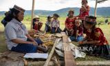Warga adat suku Lore menunjukkan cara membuat kain berbahan kulit kayu kepada anak-anak di Desa Bariri, Lore Tengah, Poso, Sulawesi Tengah, Jumat (16/6/2023). Para tetua adat di daerah tersebut mengajarkan sejak dini kepada anak-anak cara pembuatan kain kulit kayu untuk meneruskan tradisi mereka. (FOTO : ANTARA FOTO/Basri Marzuki)