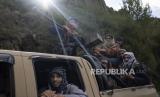 Satuan bersenjata Taliban mengendarai truk pikap di sebuah jalan di provinsi Wardak, Afghanistan, Senin (19/6/2023). (FOTO : AP/ Rodrigo Abd)
