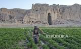 Seorang petani bekerja di ladang dekat sisa-sisa patung Buddha raksasa yang dihancurkan oleh Taliban pada tahun 2001, di Bamiyan, Afghanistan, Senin (19/6/2023). (FOTO : AP Photo/Ebrahim Noroozi)