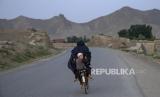 Seorang pria membonceng anak di belakang sepeda di provinsi Wardak, Afghanistan, Senin (19/6/2023). (FOTO : AP Photo/Ebrahim Noroozi)