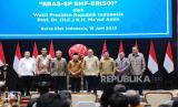 Wakil Presiden Maruf Amin (keempat kiri) bersama Sekretaris Jenderal Masyarakat Ekonomi Syariah Iggi Haruman Achsien, Ketua Eksekutif Pengawas Pasar Modal Keuangan Derivatif dan Bursa Karbon OJK Inarno Djajadi, Wakil Menteri Keuangan RI Suahasil Nazara, Wakil Menteri BUMN Kartika Wirjoatmodjo, Direktur Utama PT Bank Syariah Indonesia Tbk Hery Gunardi, Direktur Utama PT Sarana Multigriya Finansial (persero) Ananta Wiyogo, dan Direktur Utama PT Bursa Efek Indonesia (BEI) Iman Rachman (dari kiri) saat seremoni pencatatan perdana EBAS-SP SMF-BRIS01 di BEI, Jakarta, Senin (19/6/2023). EBAS-SP SMF-BRIS01 hasil kerjasama PT Bank Syariah Indonesia Tbk (BRIS) dan PT Sarana Multigriya Finansial (SMF) ini menjadi gebrakan baru tumbuhkan ekonomi syariah. (FOTO : Dok Republika)