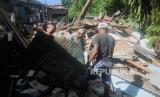Sejumlah warga bersama relawan mencari barang berharga dari puing-puing bangunan yang hancur akibat longsor di Jalan Babakan Fakultas, Tegallega, Kota Bogor, Jawa Barat, Selasa (20/6/2023). Longsor yang diakibatkan hujan deras pada Senin (19/6/2023), membuat satu bangunan Majelis Taklim Darul Musthofa hancur rata oleh tanah longsoran. Tidak ada korban jiwa dalam peristiwa tersebut namun kondisi tebingan longsor yang masih labil berpotensi membuat terjadinya longsor susulan yang dapat menghantam pemukiman warga. (FOTO : Republika/Putra M. Akbar)