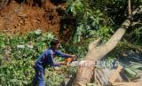 Petugas memotong pohon yang terdampak longsor di Jalan Babakan Fakultas, Tegallega, Kota Bogor, Jawa Barat, Selasa (20/6/2023). Longsor yang diakibatkan hujan deras pada Senin (19/6/2023), membuat satu bangunan Majelis Taklim Darul Musthofa hancur rata oleh tanah longsoran. Tidak ada korban jiwa dalam peristiwa tersebut namun kondisi tebingan longsor yang masih labil berpotensi membuat terjadinya longsor susulan yang dapat menghantam pemukiman warga. (FOTO : Republika/Putra M. Akbar)