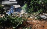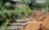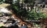 Seorang warga melihat kondisi tanah longsor di Jalan Babakan Fakultas, Tegallega, Kota Bogor, Jawa Barat, Selasa (20/6/2023). Longsor yang diakibatkan hujan deras pada Senin (19/6/2023), membuat satu bangunan Majelis Taklim Darul Musthofa hancur rata oleh tanah longsoran. Tidak ada korban jiwa dalam peristiwa tersebut namun kondisi tebingan longsor yang masih labil berpotensi membuat terjadinya longsor susulan yang dapat menghantam pemukiman warga. (FOTO : Republika/Putra M. Akbar)