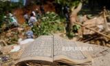 Buku Iqra yang ditemukan diantara puing-puing bangunan yang hancur akibat longsor di Jalan Babakan Fakultas, Tegallega, Kota Bogor, Jawa Barat, Selasa (20/6/2023). Longsor yang diakibatkan hujan deras pada Senin (19/6/2023), membuat satu bangunan Majelis Taklim Darul Musthofa hancur rata oleh tanah longsoran. Tidak ada korban jiwa dalam peristiwa tersebut namun kondisi tebingan longsor yang masih labil berpotensi membuat terjadinya longsor susulan yang dapat menghantam pemukiman warga. (FOTO : Republika/Putra M. Akbar)