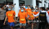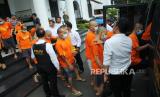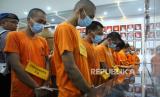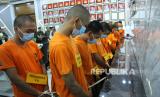 REPUBLIKA.CO.ID,BANDUNG -- Para tersangka dihadirkan saat konferensi pers kasus penyalahgunaan narkotika di Mapolrestabes Bandung, Selasa (20/6/2023).