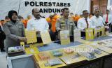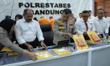 Kapolrestabes Bandung Kombes Pol Budi Sartono memperlihatkan barang bukti saat konferensi pers kasus penyalahgunaan narkotika di Mapolrestabes Bandung, Selasa (20/6/2023). Satuan Reserse Narkoba Polrestabes Bandung telah menyita narkoba jenis sabu sebanyak 4,7 kilogram, 56 tablet ekstasi, 22 ponsel, 16 timbangan digital, dan barang bukti lainnya dari hasil pengungkapan 17 kasus penyalahgunaan narkotika selama kurun waktu satu bulan sejak Mei 2023. Dari 25 tersangka mempunyai latar belakang yang beragam seperti tukang ojek, pegawai swasta, dan ibu rumah tangga. Dalam operasi pengungkapan kasus narkotika tersebut, tersangka terancam pidana hukuman penjara maksimal 20 tahun atau seumur hidup, dan denda paling banyak sebesar Rp10 miliar, subsider tiga bulan. (FOTO : Edi Yusuf/Republika)