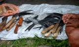 Beberapa pisau dan alat pertanian yang sudah jadi di Gamping, Sleman, Yogyakarta, Selasa (20/6/2023). Jelang Hari Raya Idul Adha 1444H permintaan pisau baru dan reparasi mengalami peningkatan dibandingkan hari biasa. Pisau dan alat pertanian yang dibuat secara tradisional ini dijual mulai Rp 100 ribuan, sedangkan untuk reparasi pisau atau alat pertanian dikenakan biaya mulai Rp 15 ribuan. (FOTO : Republika/Wihdan Hidayat)