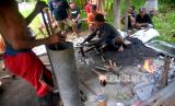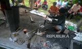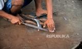 Pandai besi mengerjakan reparasi pisau di Gamping, Sleman, Yogyakarta, Selasa (20/6/2023). Jelang Hari Raya Idul Adha 1444H permintaan pisau baru dan reparasi mengalami peningkatan dibandingkan hari biasa. Pisau dan alat pertanian yang dibuat secara tradisional ini dijual mulai Rp 100 ribuan, sedangkan untuk reparasi pisau atau alat pertanian dikenakan biaya mulai Rp 15 ribuan. (FOTO : Republika/Wihdan Hidayat)