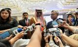 Duta Besar (Dubes) Arab Saudi untuk Indonesia Faisal Abdullah Amodi menjawab pertanyaan wartawan usai kegiatan pelepasan tamu jamaah haji undangan Raja Salman di Jakarta, Rabu (21/6/2023). Sebanyak 50 jamaah haji asal Indonesia menjadi tamu undangan dari Raja Salman Bin Abdulaziz Alsaud untuk berangkat ke Tanah Suci pada hari ini Rabu (21/6) untuk melaksanakan Ibadah Haji 1444 Hijriah. (FOTO : Republika/Thoudy Badai)