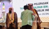 Duta Besar (Dubes) Arab Saudi untuk Indonesia Faisal Abdullah Amodi bersalaman dengan Imam Besar Masjid Istiqlal Nasaruddin Umar saat kegiatan pelepasan tamu jamaah haji undangan Raja Salman di Jakarta, Rabu (21/6/2023). Sebanyak 50 jamaah haji asal Indonesia menjadi tamu undangan dari Raja Salman Bin Abdulaziz Alsaud untuk berangkat ke Tanah Suci pada hari ini Rabu (21/6) untuk melaksanakan Ibadah Haji 1444 Hijriah. (FOTO : Republika/Thoudy Badai)