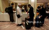 Jamaah haji undangan Raja Salman menyiapkan perlengkapannya sebelum berangkat ke Tanah Suci di Jakarta, Rabu (21/6/2023). Sebanyak 50 jamaah haji asal Indonesia menjadi tamu undangan dari Raja Salman Bin Abdulaziz Alsaud untuk berangkat ke Tanah Suci pada hari ini Rabu (21/6) untuk melaksanakan Ibadah Haji 1444 Hijriah. (FOTO : Republika/Thoudy Badai)