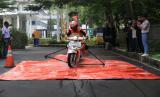 Pengendara sepeda motor mendemonstrasikan teknologi keselamatan berkendara sebagai bagian dari rangkaian acara Focus Group Discussion mengenai keselamatan berkendara bagi pengendara sepeda motor yang diselenggarakan oleh Road Safety Association (RSA) di Jakarta, Rabu (21/6). Acara tersebut mengemukakan kerentanan pengendara sepeda motor terhadap kecelakaan lalu lintas sehingga intervensi teknologi seperti anti-lock braking system (ABS) pada kendaraan menjadi faktor penting sebagai upaya untuk meminimalkan terjadinya kecelakaan. (FOTO : Dok. Republika)