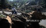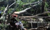 Pengendara motor melintas di dekat bagian pohon yang tumbang di Jalan Salak, Kota Bogor, Jawa Barat, Selasa (20/6/2023). Pohon Bunut dengan tinggi lebih dari 10 meter yang berusia ratusan tahun tersebut tumbang akibat hujan deras disertai angin kencang pada Senin (19/6/2023), hingga menimpa wisma dan lima kios UMKM. Tidak ada korban jiwa pada peristiwa tersebut namun bagian potongan pohon tersebut masih menutup setengah jalan sehingga mengganggu arus lalu lintas. (FOTO : Republika/Putra M. Akbar)