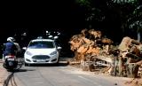 Sejumlah kendaraan melintas di dekat bagian pohon yang tumbang di Jalan Salak, Kota Bogor, Jawa Barat, Selasa (20/6/2023). Pohon Bunut dengan tinggi lebih dari 10 meter yang berusia ratusan tahun tersebut tumbang akibat hujan deras disertai angin kencang pada Senin (19/6/2023), hingga menimpa wisma dan lima kios UMKM. Tidak ada korban jiwa pada peristiwa tersebut namun bagian potongan pohon tersebut masih menutup setengah jalan sehingga mengganggu arus lalu lintas. (FOTO : Republika/Putra M. Akbar)