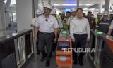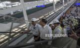 Menko Marves Luhut Binsar Pandjaitan (kiri) menaiki eskalator setibanya di Stasiun Kereta Cepat Jakarta Bandung (KCJB) Tegalluar, Kabupaten Bandung, Kamis (22/6/2023). Menteri Koordinator Bidang Maritim dan Investasi (Menko Marves) Luhut Binsar Pandjaitan bersama Menteri Perhubungan Budi Karya Sumadi dan Gubernur Jawa Barat Ridwan Kamil melakukan uji coba menumpangi KCJB dari Stasiun Halim menuju Stasiun Tegalluar dengan kecepatan maksimum 385 kilometer per jam. Selain itu, Menko Marves bersama rombongan meninjau sejumlah fasilitas, sarana dan prasarana pendukung KCJB di Stasiun KCJB Tegalluar serta Depo KCJB. (FOTO : ABDAN SYAKURA/REPUBLIKA)