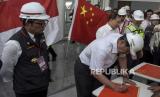 Menko Marves Luhut Binsar Pandjaitan (kedua kiri) disaksikan Gubernur Jawa Barat Ridwan Kamil (kiri) menuliskan pesan saat meninjau Stasiun Kereta Cepat Jakarta Bandung (KCJB) di Tegalluar, Kabupaten Bandung, Kamis (22/6/2023). Menteri Koordinator Bidang Maritim dan Investasi (Menko Marves) Luhut Binsar Pandjaitan bersama Menteri Perhubungan Budi Karya Sumadi dan Gubernur Jawa Barat Ridwan Kamil melakukan uji coba menumpangi KCJB dari Stasiun Halim menuju Stasiun Tegalluar dengan kecepatan maksimum 385 kilometer per jam. Selain itu, Menko Marves bersama rombongan meninjau sejumlah fasilitas, sarana dan prasarana pendukung KCJB di Stasiun KCJB Tegalluar serta Depo KCJB. (FOTO : ABDAN SYAKURA/REPUBLIKA)