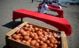 Panitia menyiapkan meja dan telur ayam untuk puncak perayaan Peh Cun 2023 di Pantai Parangtritis, Yogyakarta, Kamis (22/6/2023). Perayaan Peh Cun digelar rutin setia tahun pada Tanggal 5 Bulan 5 penanggalan Lunar atau Imlek. Pada perayaan ini warga Tionghoa mengucapkan syukur pada musim kemarau sekaligus mengenang negarawan Tiongkok, Qy Yuan sebagai orang yang pandai dan jujur mengabdi pada negaranya. Saat upacara didahului dengan berdoa bersama dan kemudian bersama-sama mencoba mendirikan telur pada di atas meja. (FOTO : Republika/Wihdan Hidayat)