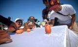 Pengunjung pantai ikut mencoba mendirikan telur saat puncak perayaan Peh Cun 2023 di Pantai Parangtritis, Yogyakarta, Kamis (22/6/2023). Perayaan Peh Cun digelar rutin setia tahun pada Tanggal 5 Bulan 5 penanggalan Lunar atau Imlek. Pada perayaan ini warga Tionghoa mengucapkan syukur pada musim kemarau sekaligus mengenang negarawan Tiongkok, Qy Yuan sebagai orang yang pandai dan jujur mengabdi pada negaranya. Saat upacara didahului dengan berdoa bersama dan kemudian bersama-sama mencoba mendirikan telur pada di atas meja. (FOTO : Republika/Wihdan Hidayat)