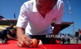 Warga keturunan Tionghoa mencoba mendirikan telur saat puncak perayaan Peh Cun 2023 di Pantai Parangtritis, Yogyakarta, Kamis (22/6/2023). Perayaan Peh Cun digelar rutin setia tahun pada Tanggal 5 Bulan 5 penanggalan Lunar atau Imlek. Pada perayaan ini warga Tionghoa mengucapkan syukur pada musim kemarau sekaligus mengenang negarawan Tiongkok, Qy Yuan sebagai orang yang pandai dan jujur mengabdi pada negaranya. Saat upacara didahului dengan berdoa bersama dan kemudian bersama-sama mencoba mendirikan telur pada di atas meja. (FOTO : Republika/Wihdan Hidayat)