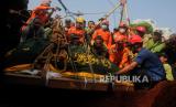 Petugas menurunkan jenazah Muhammad Fajri ke liang lahat menggunakan tali katrol di TPU Menteng Pulo, Jakarta, Kamis (22/6/2023). Muhammad Fajri yang merupakan penderita penyakit obesitas dengan bobot 300 kilogram tersebut meninggal dunia setelah menjalani perawatan selama 14 hari di Rumah Sakit Cipto Mangunkusumo. Proses pemakaman yang melibatkan Petugas Dinas Penanggulangan Kebakaran dan Penyelamatan, Basarnas dan Dinas Pertamanan dan Hutan Kota DKI Jakarta tersebut menggunakan forklift portable, tali katrol dan makam berukuran 4x2 meter dan kedalaman 1,8 meter. (FOTO : Republika/Putra M. Akbar)