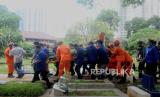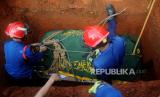 Petugas bersiap menurunkan jenazah Muhammad Fajri ke liang lahat menggunakan tali katrol di TPU Menteng Pulo, Jakarta, Kamis (22/6/2023). Muhammad Fajri yang merupakan penderita penyakit obesitas dengan bobot 300 kilogram tersebut meninggal dunia setelah menjalani perawatan selama 14 hari di Rumah Sakit Cipto Mangunkusumo. Proses pemakaman yang melibatkan Petugas Dinas Penanggulangan Kebakaran dan Penyelamatan, Basarnas dan Dinas Pertamanan dan Hutan Kota DKI Jakarta tersebut menggunakan forklift portable, tali katrol dan makam berukuran 4x2 meter dan kedalaman 1,8 meter. (FOTO : Republika/Putra M. Akbar)