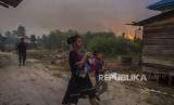 Seorang warga menggendong anaknya saat terjadi kebakaran lahan di dekat permukiman di Kecamatan Landasan Ulin, Banjarbaru, Kalimantan Selatan, Jumat (23/6/2023). Kencangnya angin di lokasi kebakaran lahan membuat api dengan cepat menyebar membakar lahan mencapai puluhan hektare dan hingga kini tim gabungan BPBD, Brimob dibantu relawan pemadam kebakaran masih berupaya memadamkan api yang mendekati permukiman penduduk. (FOTO : Antara/Bayu Pratama S )